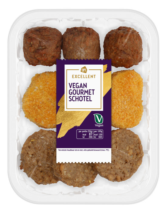 Vegan gourmetschotel: de vegan gourmetschotel bestond uit drie mini hamburgers, drie balletjes en drie kipnuggets. Ook deze variant viel erg bij ons in de smaak. De hamburgertjes en balletjes smaakten erg goed en lekker kruidig. De smaak leek best wel op de smaak van vlees. Vooral de nuggets vielen erg in de smaak bij Joey. Hij vond deze het lekkerste van alle gereviewde gourmet hapjes. Hij vond de smaak erg goed en vond de nuggets lijken op reguliere kip nuggets.